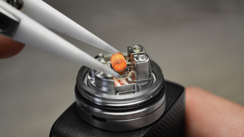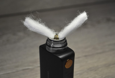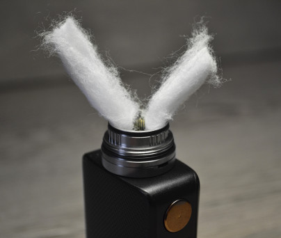 Ставим вату, тут этот процесс малость специфичный. Сначала ее потребуется завести внутрь спирали, а после этого концы поднять вверх, словно кроличьи ушки, и надеть сверху кольцо. В качестве ватки используем знаменитый «Бекон», но можно и любую другую, проблем с жижеподачей тут быть не должно.