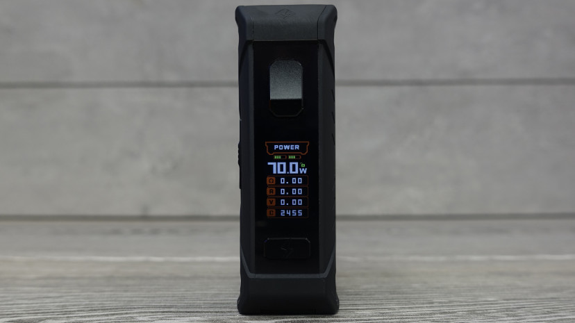 На торце GeekVape Aegis L200 Classic примечательной особенностью стало наличие пусть и не большого, но дисплея и пары кнопок. Подле него расположились качелька настройки и кнопка «Fire». Все это как бы утоплено относительно основного контура устройства – к верху и низу от этих элементов выступают фаски корпуса. На них же находится порт Type-C для зарядки.