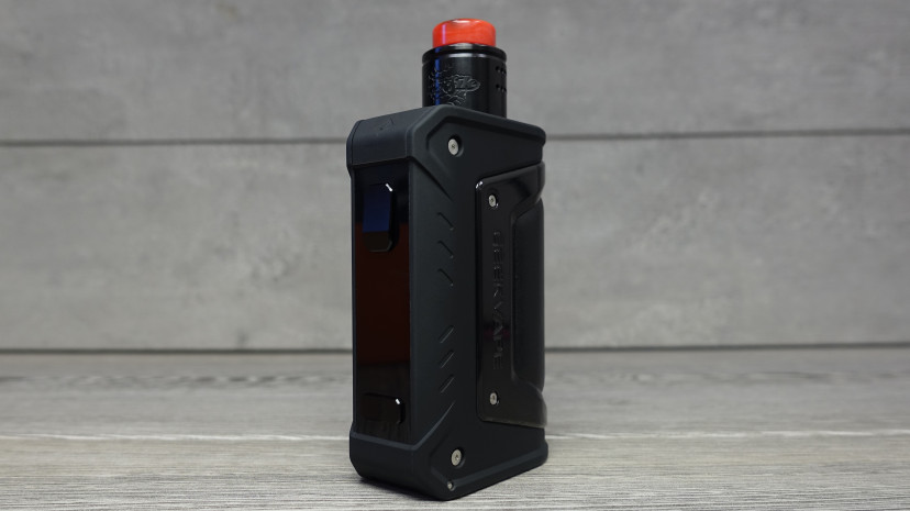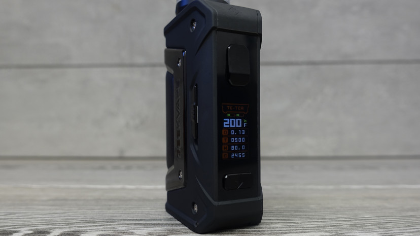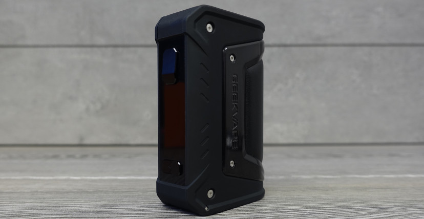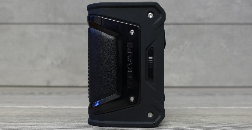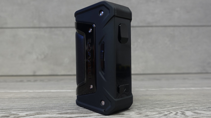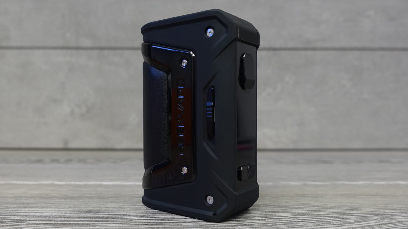 На боковинах Aegis L200 Classic можно выделить уже ставшим традиционным слайдер блокировки и декоративный элемент в виде металлической вставки с названием GeekVape. Никаких других примечательных деталей нет – довольно строгое решение.
