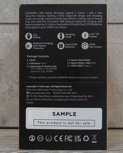 Перед нами привычная для Гиквейп упаковка. На лицевой стороне можно приметить изображение комплекта Л200 Классик, а сзади краткую информацию о продукте. Там же расположились всяческие эмблемы и защиты, а еще наклейка о том, что это технический образец.