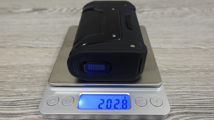 Вес у новинки соответствующий – целых 203 грамма. Да, это ощутимо много, если выразиться мягко. В кармане (если он туда влезет) очень ощущается, как и в ладошке. Конечно, это обусловлено форматом батарей – напомним, в Aegis L200 Classic предполагается использование 21700.