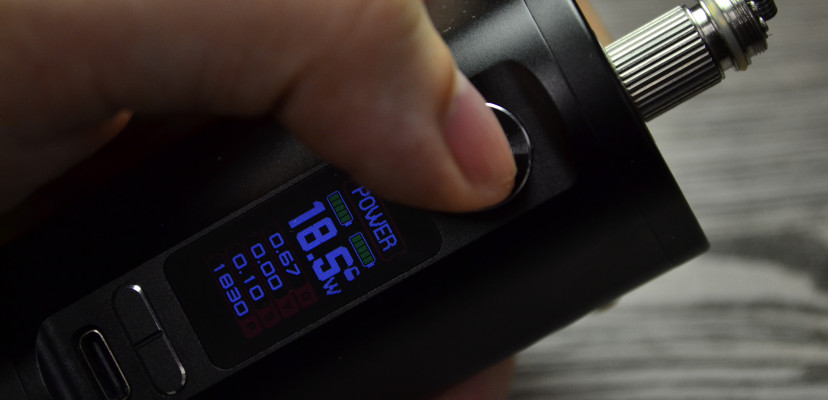 Отличительная черта боксмодов от большинства Подиков – наличие экрана, который подскажет, какое итоговое сопротивление получилось у спиральки. В нашем случае это 0.67 Ом, то есть как раз посередине между подходящими испарителями.